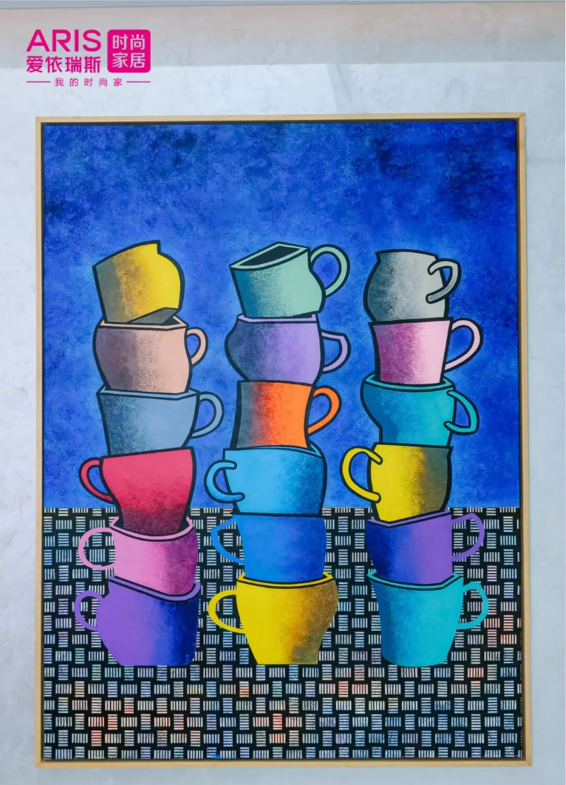 走廊與會客廳分別陳列陳雷老師的《數(shù)字女孩》與《杯》,鮮明高飽和度的色彩語言極具辨識度,堆疊的杯子傳遞出平靜而穩(wěn)定的視覺感受,仿佛能嗅見咖啡的醇厚香氣。