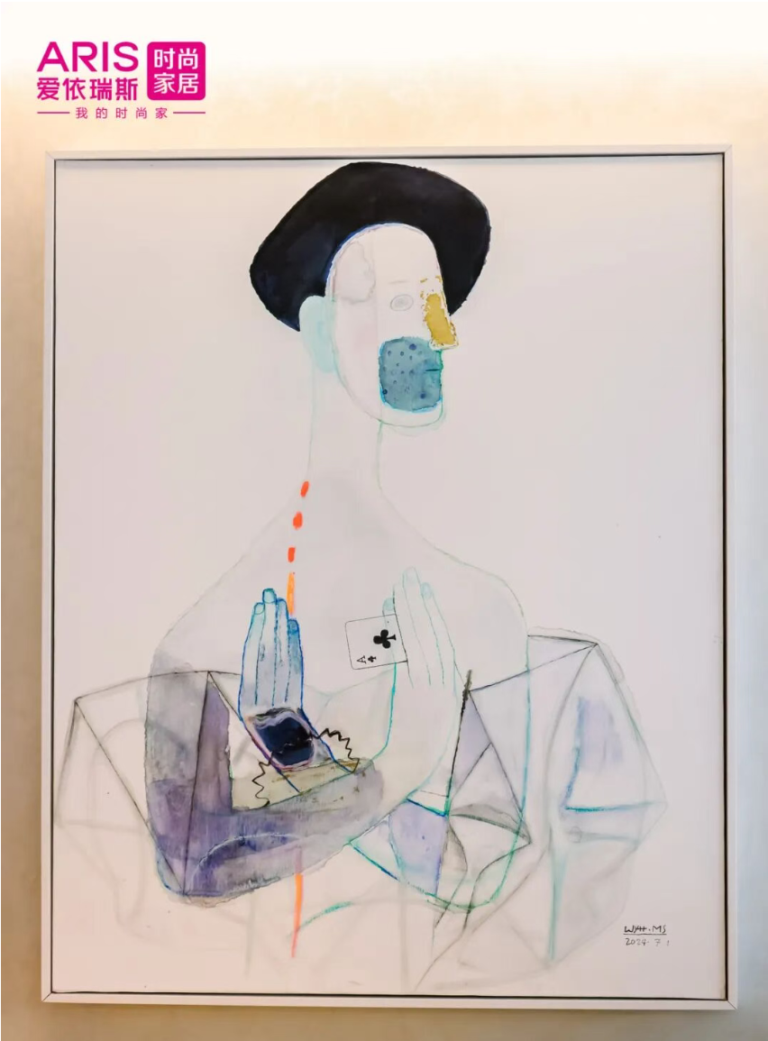 入戶玄關(guān)處,陳雷老師的作品《錢幣的游戲》以鮮明的色彩構(gòu)建視覺張力。當(dāng)被問及畫作含義時(shí),陳雷老師表示:“每位觀者基于自身經(jīng)歷與觀念,都會對作品產(chǎn)生不同的解讀,這正是藝術(shù)的魅力所在。”