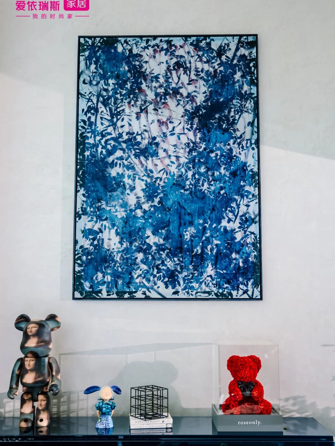 客廳墻面懸掛潘劍老師的作品《Z-180133》,畫面如雨后隔霧所見的朦朧樹影,與窗外的湖光秋色、自然天光、水晶吊燈的水滴感以及深藍(lán)色升降酒柜形成和諧共鳴,在抽象與寫實(shí)之間,勾勒出客廳的自然秋韻。
